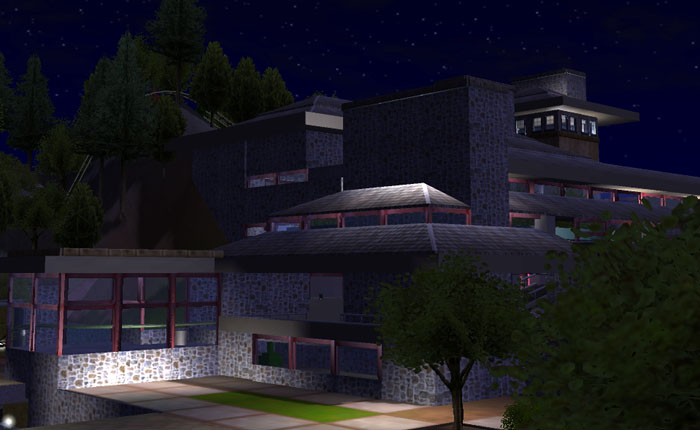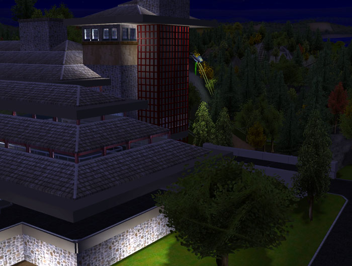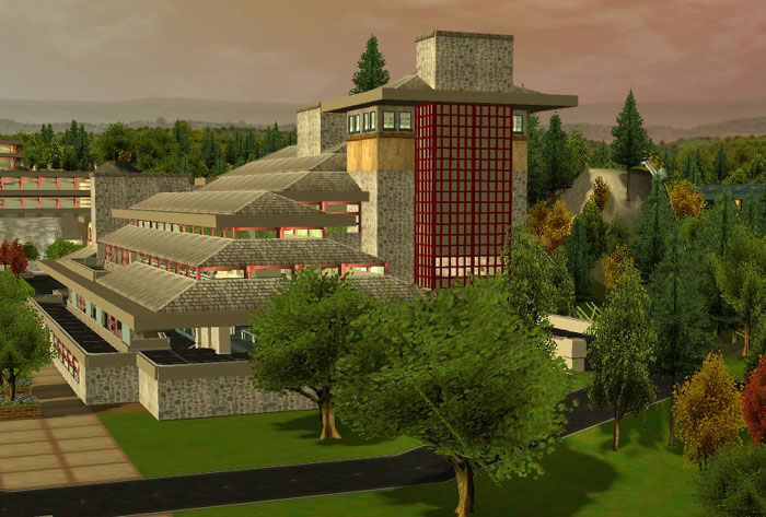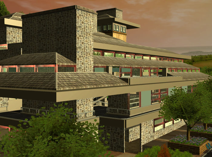 This tower was added after the building was actually completed. It seemed to lack character so I went back to some Frank Lloyd Wright sites and found the inspiration form Taliesin East. This is the only feature on the building directly inspired by an actual FLW building.
